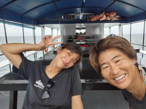アイカは調査ダイブ、潜った後は、タンク充填、器材の片付け。
