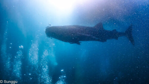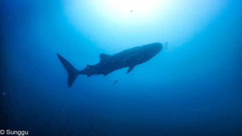 ダイバーのいるごちゃごちゃエリアからかなりの距離を取って、誰にも気づかれず、独りで悠々と泳ぐジンベエ!