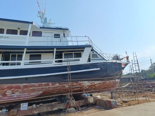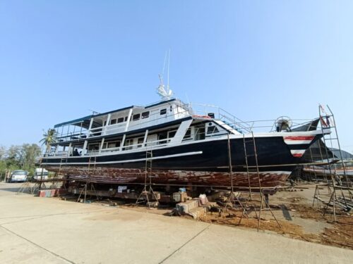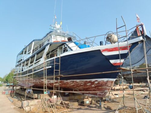 水の上の部分船腹?はとっとと終わって、ペンキが塗られていきます。