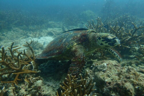 サンゴに甲羅を擦り付けてかゆい所をゴシゴシ擦ってました!タイマイだ!